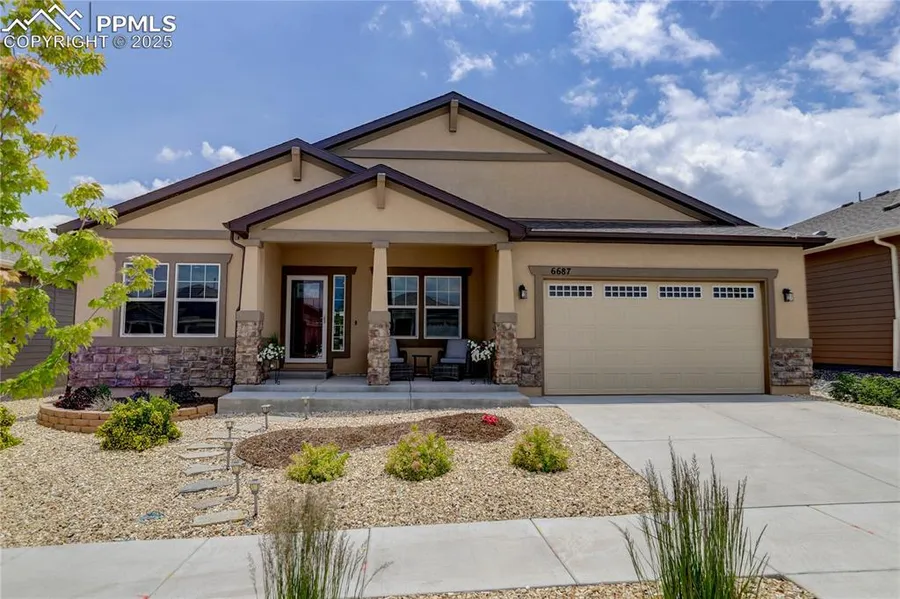 Like-new rancher in Wolf Ranch! This beautifully maintained Mont Blanc floor plan by Challenger Homes offers a bright, open layout enhanced by abundant natural light. A spacious living room is great for entertaining with a stacked-stone gas fireplace and large windows. This flows seamlessly into the kitchen which features a walk-in pantry, granite counters, an island with barstool seating, & stainless-steel appliances that include a double oven. The adjacent dining area walks out to a covered patio with pergola-perfect for relaxing evenings. Unwind in the main level primary bedroom with walk-in closet & private en-suite bath. A private office offers a quiet space for work or study and comes with a bookshelf. The finished basement provides expansive room for recreation & has been pre-plumbed for a wet bar. There is ample accommodation for family and friends with four additional bedrooms t...