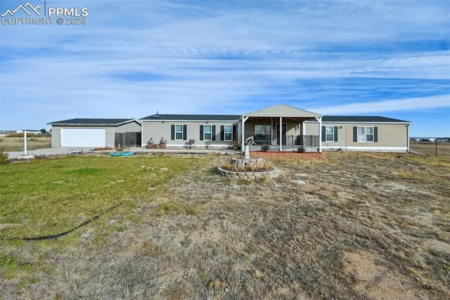 Horse-Zoned with Mountain Views! This home 2.66 acres with no HOA and zoned for horses, this spacious 5-bedroom, 2-bath manufactured home offers 2,322 sq. ft. of comfortable living space plus an office, oversized pantry, and a permitted engineered addition. (Blueprints Available) Recent upgrades include new LVP flooring, fresh carpet and paint, and an updated primary bathroom. Enjoy abundant natural light from Pella windows, an Andersen sliding glass door, and two skylights. The home is thoughtfully designed with ADA-friendly features such as a compliant bathroom, concrete ramp, and covered front porch for easy accessibility. Modern conveniences include central A/C, ceiling fans, a tankless water heater, generator hook-up with cut-off switch, and a new dishwasher. The home rests on a HUD-compliant foundation, with the septic system upgraded in 2020 with a new leach field and diverter. An exterior storm shelter provides added peace of mind. Outdoors, you'll find a detached two-car garage, 26x12 loafing shed, storage shed, animal pen, and a 30-amp RV hookup. The acreage is fenced on three sides and showcases sweeping views of Pikes Peak. Home and Land recently purged. Conveniently located near Ellicott schools, local dining, gas station, and general store-and just 15 minutes from Colorado Springs-this property perfectly blends rural tranquility, modern updates, and everyday convenience.