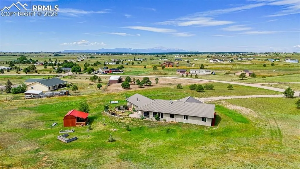 Peaceful country living with stunning views of the Front Range and Pikes Peak from this 4-bedroom, 3-bathroom home set on 5 usable acres. Zoned for horses, this property offers space, functionality, and flexibility both inside and out. Inside, the open floor plan features luxury vinyl plank flooring throughout the main living areas. The large living room is a true highlight with vaulted ceilings, abundant natural light, and a wet bar—perfect for entertaining or relaxing. The kitchen offers stainless steel appliances, a propane line pre-run to the oven/range, a center island, and ample cabinet and counter space to meet all your cooking and storage needs. The primary suite is a private retreat, complete with vaulted ceilings, a spacious walk-in closet, and a 5-piece en-suite bathroom. Three additional bedrooms and a full bathroom provides plenty of room for family, guests, or a home office setup. Outdoors, there’s room to roam with a storage shed for tools or equipment, and an oversized 3-car garage that offers extra space for vehicles, hobbies, or a workshop. Whether you're looking for wide-open space, horse property, or just a quiet place with unbeatable views, this home checks all the boxes!