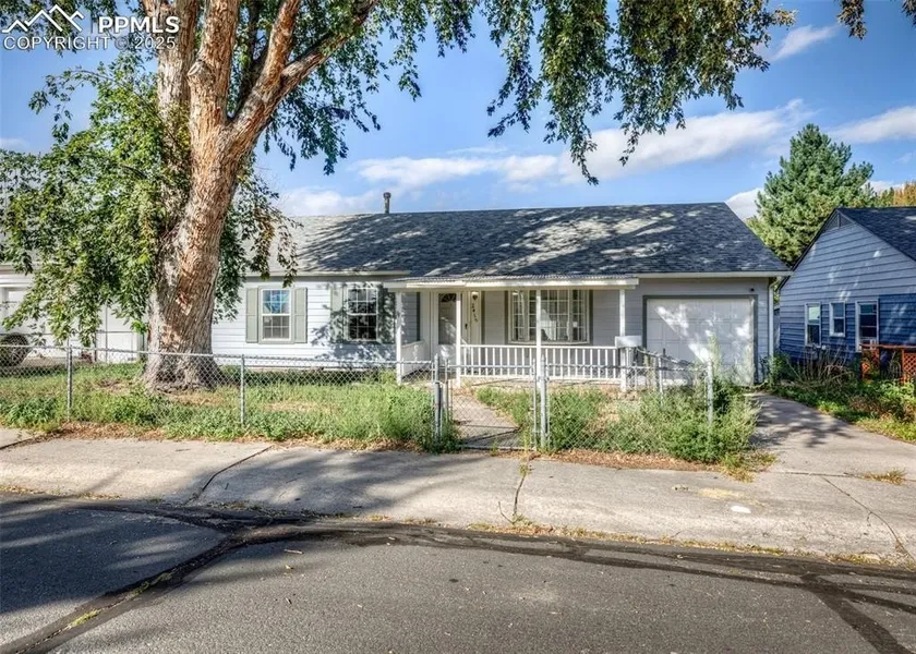 Charming and spacious 4 bedroom 2 bathroom ranch plan home with great updates and a versatile layout! The large fenced front yard with a huge shade tree and covered concrete porch creates a welcoming first impression. Inside, the expansive living room features hardwood floors, a ceiling fan, and a large picture window for natural light. The kitchen offers tile flooring, plenty of wood cabinets, a new stainless refrigerator, and an electric range, with a window overlooking the backyard. The dining area includes a slider to the fenced yard with a concrete patio and storage shed-perfect for entertaining or relaxing outdoors. Hardwood floors continue through the hall and bedrooms. The primary suite has an attached bath with updated vanity and tiled walk-in shower. Two additional bedrooms share a hall bath with newer vanity, lighting, and tiled tub/shower combo. A carpeted bonus room off the kitchen includes a window seat and access to the garage and basement. The fourth bedroom offers carpet, two windows, and great storage. The lower level adds an extra family or recreation room, while the extended one-car garage provides shelving and workspace. Enjoy central A/C, mature trees, and both front and back yard space. A wonderful blend of comfort, charm, and functionality all in a great west side location. Close to shops, dining, and Ft Carson.