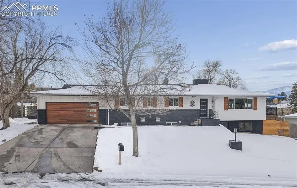 Located in the coveted Palmer Park neighborhood this fully remodeled 6-bedroom home showcases show-stopping, unobstructed mountain views that capture the heart of Colorado living. Step through the front door into a bright, open-concept living room and kitchen filled with natural light from skylights and expansive windows perfectly framing the mountain backdrop. A Majestic gas fireplace with custom plaster finish and mantle anchors the main living space, offering a contemporary yet cozy focal point. The remodeled kitchen features an oversized island with seating, wine fridge, custom tile work, quartz countertops, and flows effortlessly into the open dining area-ideal for entertaining. The main-level primary suite includes a walk-in closet, private access to the back patio, and a spa-like en suite bathroom with double vanities and a large walk-in shower. Two additional bedrooms and a full bath complete the main floor. The lower level offers expansive additional living space with a second Majestic gas fireplace, three additional bedrooms, including a junior suite with office/bonus room, access to a Jack-and-Jill bath, and a well-appointed laundry room featuring new cabinetry. Modern finishes throughout add charm and sophistication, while extensive upgrades provide true peace of mind. 2022 new roof, windows, furnace, water heater, and appliances. Outdoor living is equally impressive. Dual patio access opens to a beautifully updated backyard featuring a new Trex deck overlooking the mountains, hot tub, resurfaced concrete walkway and patio, and a fully updated sprinkler system. Thoughtfully designed landscaping includes boulders, pavers, crushed granite, flagstone, and a firepit, all complemented by mature trees. Enjoy the best of central Colorado Springs living with convenient access to shopping, dining, and nearby nature reserves such as Overlook at Palmer Park and Palmer Park Mesa-all while enjoying privacy, views, and luxury upgrades throughout.