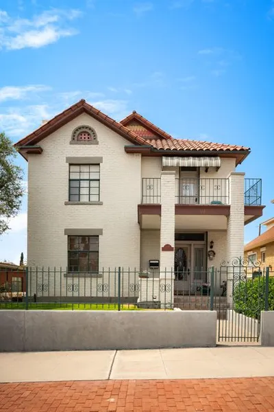 This Sunset Heights historic two-story brick home has all the modern upgrades yet maintains historical charm. The curb appeal doesn't end with the green lawns, mature trees and ornate iron fencing. A private driveway lined with bricks in a herringbone pattern leads you to a detached double car garage (once the carriage house) behind the home and beautiful backyard. Once you walk through the original leaded-beveled crystal glass front door, you will be in awe of the beautiful parlor with the original fireplace and mantel. A sophisticated dining room with chandelier and tin-tile-look ceiling provides access through a swinging-door into the kitchen and a French door to the serene back patio. Upstairs is a master suite with walk in closet, separate his-and-her closets, original clawfoot tub, separate shower and a private deck. Beautiful views of downtown El Paso and Juarez from second-floor ...