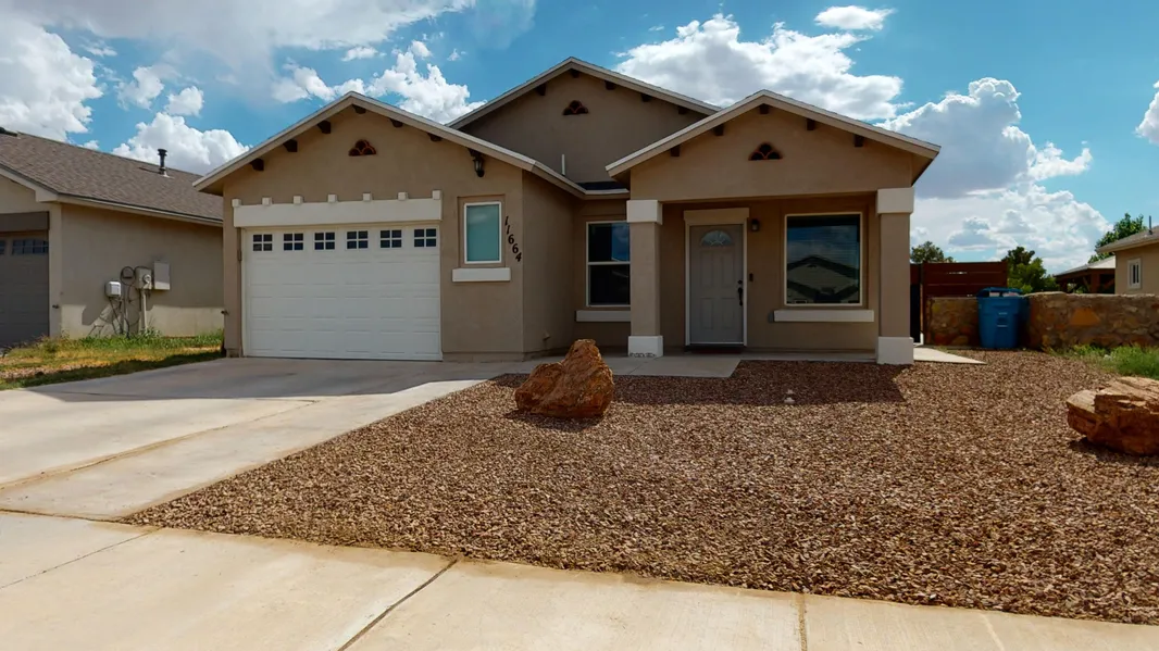 Great starter home located in the Jardin de Flores subdivision, east of El Paso. Walking in this home you will be pleasantly surprised with its modern floor plan which features 4 bedrooms and 2 baths. Carpet in all bedrooms and Tiled living areas. Kitchen opens to the Breakfast/Dinning room. Access to the back yard is through the breakfast area. Spacious backyard has a built-in fire pit great for family or guest entertainment. This is a must see home. Will not last long.