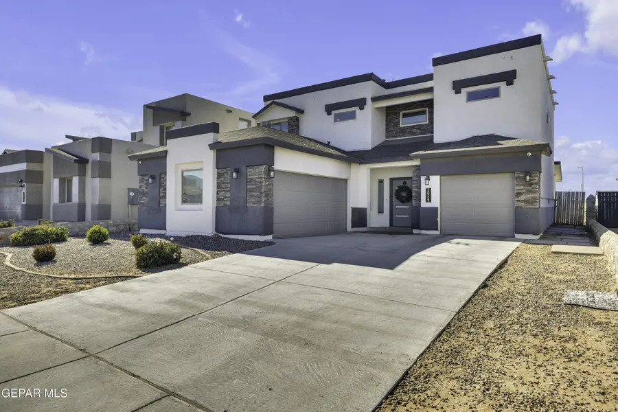 A 5-bedroom, 3-bathroom sanctuary for modern living, this El Paso home greets you with an airy floor plan and thoughtful details. The living room flows seamlessly into a dining area and kitchen, where stainless steel appliances and crisp white countertops create a fresh, functional vibe. There's a cozy reading nook upstairs. The backyard is easy to maintain, fully landscaped with artificial turf, equipped with a powered pergola wired for a TV, solar panels, and raised rock walls for extra privacy.
