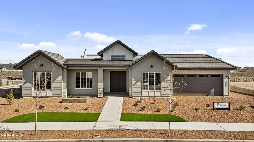 Welcome to the PODIUM Signature Plan, where your dreams are brought to life by El Paso's premier custom home builder, celebrated for exceptional quality and unmatched craftsmanship. This contemporary designed home features elegance and poise throughout. A spacious open concept living environment and high ceilings welcomes you everyday. Your gourmet kitchen is a chef's dream with plenty of storage and a large island for entertaining guests. The primary suite is flawlessly designed a luxury spa like bathroom and massive walk in closet. Guest bedrooms are conveniently located at the front of the home to enhance flow and accessibility. Not to mention, one of the bedrooms is a Junior suite offering added privacy with its own bathroom and walk in closet. Tierra Del Este is one of El Paso most desirable communities with parks, lots of shopping at your fingertips and quick access to Ft Bliss. This home can be yours today!
