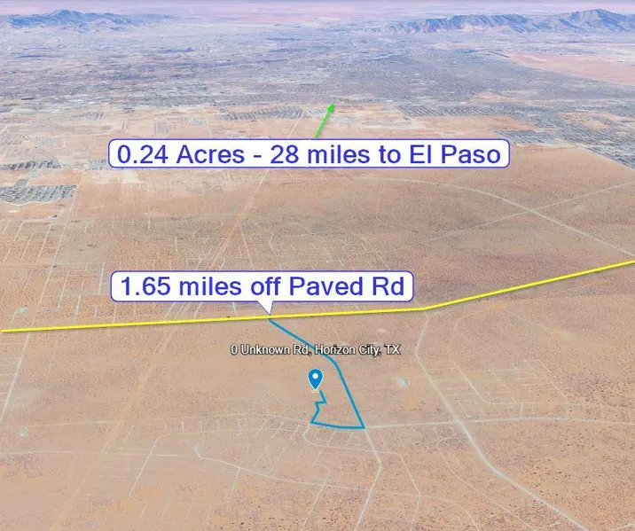 0.24 acre investor lot with no utilities, 7 miles from gas, groceries, banking and restaurants in Horizon City in the path of growth with good dirt road access only 1.65 miles from the main paved road, Ascension St. Like most of the properties in the area, this lot is in the Horizon City Improvement Association and there used to be an HOA annual fee. Some lots still have a large HOA payoff fee but there is no longer an HOA fee for this property and the annual property taxes are around 10 cents, so the holding costs are very low making this a good buy and hold investment. GPS: 1.727325, -106.133790