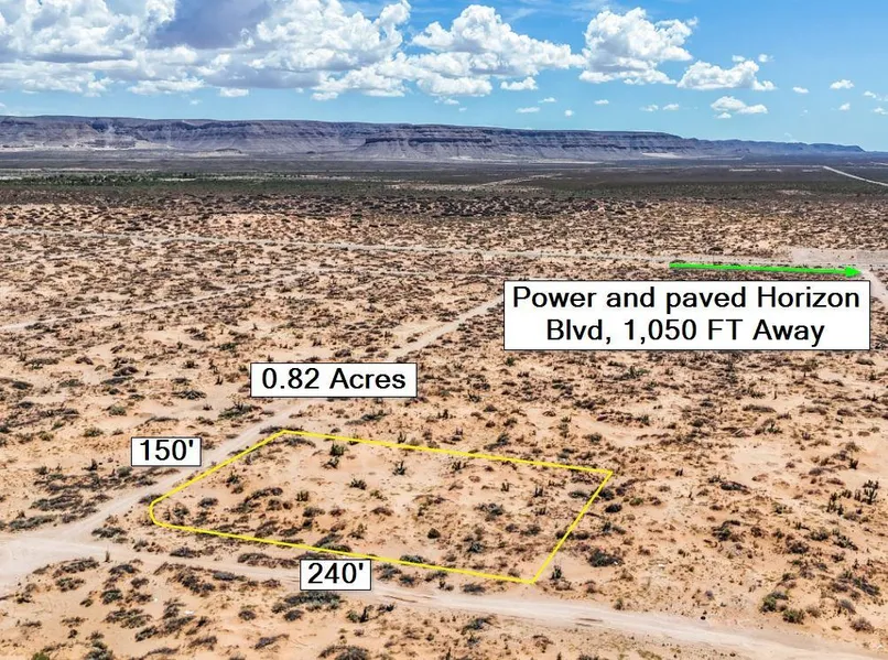 0.82 acre corner lot just 1,050 feet from the main paved road, Horizon Blvd, and 9 miles to the commercial center of Horizon City for gas, groceries, banking and restaurants with new development and growth in the area. This lot is not zoned and you can use it for residential and / or commercial purposes, such as running a business and having a home on the land. Power is 1,050 feet away on Horizon Blvd and there is no water to the property, however, the water company is currently extending the water line in this direction and its currently 1 mile away on Horizon Blvd / Indian Trail Dr. Weve seen other homes in the area with water tanks, indicating they use a water hauling service. GPS coordinates to the property: 31.685815, -106.050468