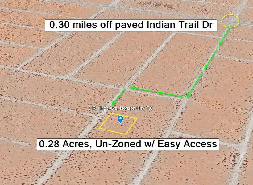 Clean, flat and square-shaped 0.26 acre lot in Horizon City, located east of El Paso, no zoning so you can develop for commercial or residential, good dirt road access just 0.30 miles from paved Indian Trail Dr, and 10 miles to the commercial center of Horizon City for gas, groceries, banking and restaurants with new development and growth in the East El Paso area. This lot is not zoned and you can use it for residential and / or commercial purposes, such as running a business and having a home on the land. There is no power or water service to any of the properties in this area so plan on setting up solar and hauling water for any development. The land is not in a flood zone and there is no HOA. GPS coordinates to the property: 31.661830, -106.066990