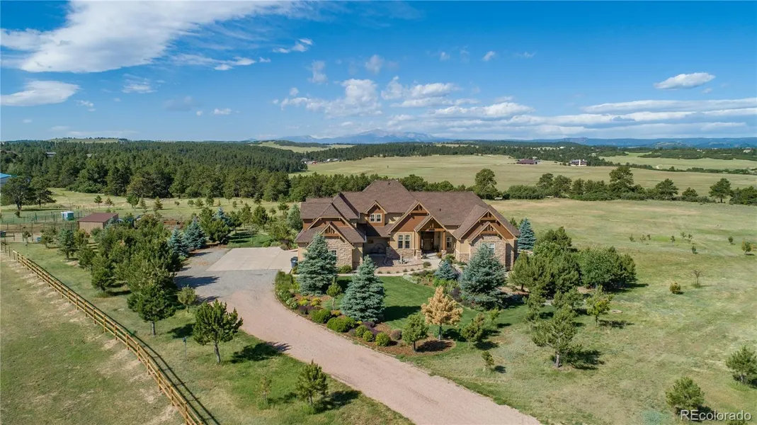 STUNNING home on 35 acres with Majestic Views of the front range mountains. Panoramic views from Longs Peak, to Pikes Peak, to the Sangre De Cristo Mountain Range, to the Spanish Peaks. Upon entry to the home, you are struck by the light filled home w/Vaulted Ceilings & Wood Beams, Stone Fireplace, & Mountain Views from every window. Open concept on the main level hosts a Living Room w/2-sided Fireplace, Great Room, Kitchen w/Island, Kitchen Nook, Formal Dining area, Office, & Master Bedroom & Bath. Two additional bedrooms w/En-Suite Baths on the very private 2nd level, which only hosts the 2 En-Suites. Walk-out Basement is currently set up as an in-home gym. This home sits amongst a meadow with professional landscaping front & back, hardscape and a beautiful & soothing water feature. Walk out your back door to the rock outcroppings with the Tree lined Ridge that overlooks the lower pasture w/seasonal creek. Enjoy your morning coffee or evening cocktail on the covered patio as you view the breathtaking beauty that surrounds you. This home sits not far off of Hwy 83 for a very easy commute to Colorado Springs, Monument, Castle Rock, & Denver.
