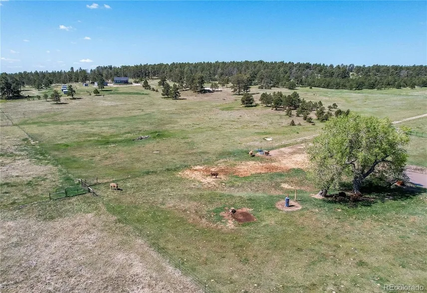 Move in ready, newer (2017) 3 bed/3 bath ranch home ideally situated on top of a knoll, overlooking a spectacular 58.70 acre site. Property features natural grass grazing pastures, a mixture of majestic Pine trees & Cottonwoods, & abundant wildlife. Step inside to an open floor plan with an expansive bright living space, offering breathtaking views of the countryside, a cozy gas stove, as well as a vaulted ceiling, adding height & architectural interest. The spacious kitchen is complete with stainless steel appliances, slab granite throughout, counter height breakfast bar & a dining area. There is an abundance of windows & sunshine along with a sliding glass door leading outside to the wrap-around deck & yard; ideal for entertaining & relaxing. The main floor private primary suite boasts a large walk-in closet & a lavish 5-piece bath with a soaking tub & double vanities. Main level includes a laundry/mud room with cabinetry & a powder room for your guests. Beautifully finished basement has a large family room with a wet bar area, 3/4 bath & 2 additional bedrooms. Neutral interior paint color of the home is set off by crisp white trim throughout. Main level is completed with LPV flooring while the downstairs is finished with plush carpet. Utility & storage area in the basement. This fabulous floor plan lives large! Zoned agricultural, property is completely fenced & cross fenced. 4 newer loafing sheds with individual paddocks are ready for horses & livestock with 3 water hydrants. There's a chicken coop/shed & fenced garden. Oversized, detached outbuilding/garage has 3 bays, a 10' high center bay door, cement floor & electric. Property has solar panel system (owned) that should meet most, if not all of your electrical needs. Low electric bills. With well, septic & solar, this home is energy efficient. Class 4 impact roofing/roof cert. Furnace serviced. An ADU or house may be added to this property or build your dream barn. No HOA, no covenants. Deeded water rights.