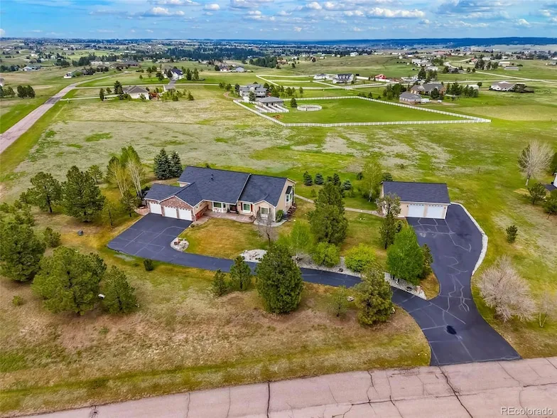 Welcome to your impeccable 5-bedroom, 3.5-bathroom home nestled on 5 acres of breathtaking Colorado landscape. With panoramic mountain views, mature trees, and a detached 1,200 sqft heated workshop/garage, this property embodies the Colorado lifestyle.The light-filled interior welcomes you with vaulted ceilings and a spacious living room featuring a stone fireplace where you can relax while enjoying mountain vistas. The large dining area overlooks the beautifully landscaped acreage and valley views. The gourmet kitchen is a chef s dream, equipped with granite countertops, a 5-burner gas range, double ovens, stainless steel appliances, and a generous island perfect for culinary endeavors. A breakfast nook with a bay window and built-in storage adds charm. Don t miss the massive mudroom with cubbies, leading to the 3-car garage.The main-level primary bedroom is a retreat with a bay window, a luxurious 5-piece ensuite bathroom with heated floors and a walk-in closet. Two oversized bedrooms complete the ranch-style layout. Venture outdoors to the 1,800 sq. ft. wraparound composite deck (mostly covered), ideal for unwinding or entertaining in style.The walk-out basement has been designed for hosting, featuring a spacious rec room, a wet bar with two wine refrigerators, a 160-bottle wine nook, a bonus room/library, a fireplace, two additional bedrooms, and a full bathroom. The detached 30x40 ft. heated workshop/garage boasts 12-ft. ceilings, two large bays with 10x10 roll-up doors, a 220 outlet, attic storage, and a half-bath, making it the perfect spot for mechanics or hobbyists alike.Value-packed features include a new HVAC system with a whole-home humidifier, a carbon water filter, fiber-optic high-speed internet, an instant hot water system, a tankless water heater, a commercial in-ground sprinkler system, and a 2018 roof. Located on paved county-maintained roads, this home is near the charming town of Elizabeth, close to schools and shopping. Don t miss it!