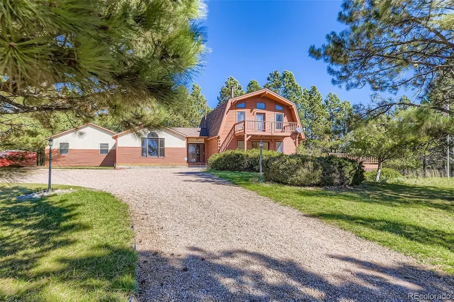 Do you love the outdoors, wide open spaces, privacy, and the feel of country living, but need a place CLOSE to work? This 3Bd/2.5 Bath Log Cabin Home on 5 Acres is covered in over 100 beautiful Ponderosa Pine Trees and is only 20 minutes to Denver. Includes 2/1 Mother-in-law/Guest Quarters with private entrance, Oversized & Heated 3 car garage with Work Shop & safe room, Hot tub with enclosed Gazebo, Large Garden & more... Come enjoy skylights and big picture windows that provide natural lighting throughout the home and a newer roof, still under warranty. This home is move in ready with several recent upgrades: New roof 2025, New carpet 2025, new well pump 2023. Plus you're going to love the lush green landscape and Large, Wrap-around deck (36x8.5 + 18x18 + 36x8.5), large covered patio, and a 18x8.5 walkout balcony to enjoy the Views, Sunrises & Sunsets. There's room to park all you cars, trucks and toys. This home is well built & ready for you to enjoy the peace of Colorado living. Come & see!