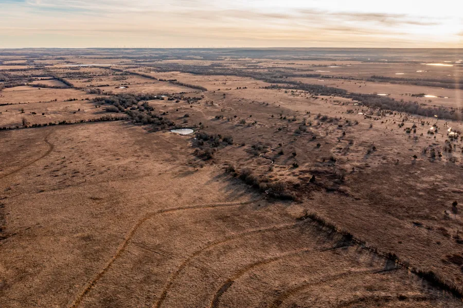 The property consists of 224 +/- acres of native pasture and 16 +/- acres of timber stand. The native grass stand has been stressed with the 2023 drought year so it would benefit from a spring burn to rejuvenate the bluestem and stewardship with lighter stocking rates for the 2024 year. In a year's time, one would be pleasantly pleased with the grass stand as the native grass is incredibly resilient. The past year has been grazed with cow/calf pairs. Average cash rent of $7,200.00 annually. In the early 1950's the northeast 40 +/- acres were broken for row crops then seeded back to grass in the 1970s. The water on the tract is impeccable. There are 5 ponds throughout the farm and a spring-fed tributary running throughout the timbered draw. This allows for great use of the grass so cattle are not overgrazing in just one area. The fencing throughout the tract is well above the average with newly replaced 5-strand fencing wrapping the farm with 5 gate entrances. Access for loading and unloading is ideal along Road 10 and being right south of 400 HWY, shipping is effortless.