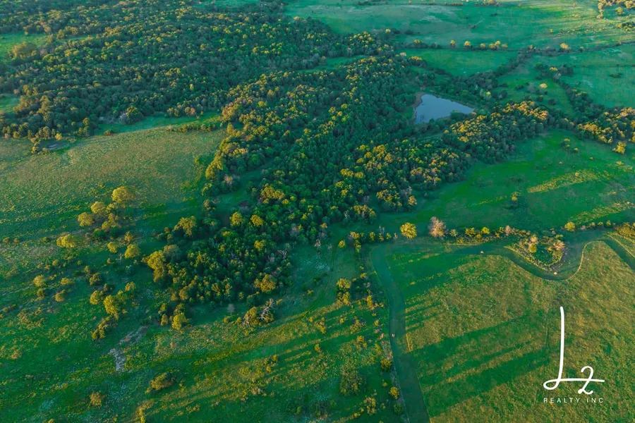 The oaks that line the ridges are symbolic of the cross timbers ecosystem. It is known for large sandstone outcroppings and a high production of acorns. This property has a balance of the cross timber ecosystem that is beginning to blend with the Eastern edge of the Flint Hills. It does have some characteristics that belong with both such as native grasses and rolling hills. North of the biggest pond is a sandstone outcropping that has a spring in it. It seeps water out that eventually runs into the pond. The perimeter fencing is intact and is currently holding a small herd of cattle. Another small field to the East is fenced separately. They would allow someone to have summer food plots and still take advantage of a summer grazing program for the cattle. A 38 x 48 foot farm utility shelter is located along Road 24 which is a dead end road and the Eastern boundary of this tract.