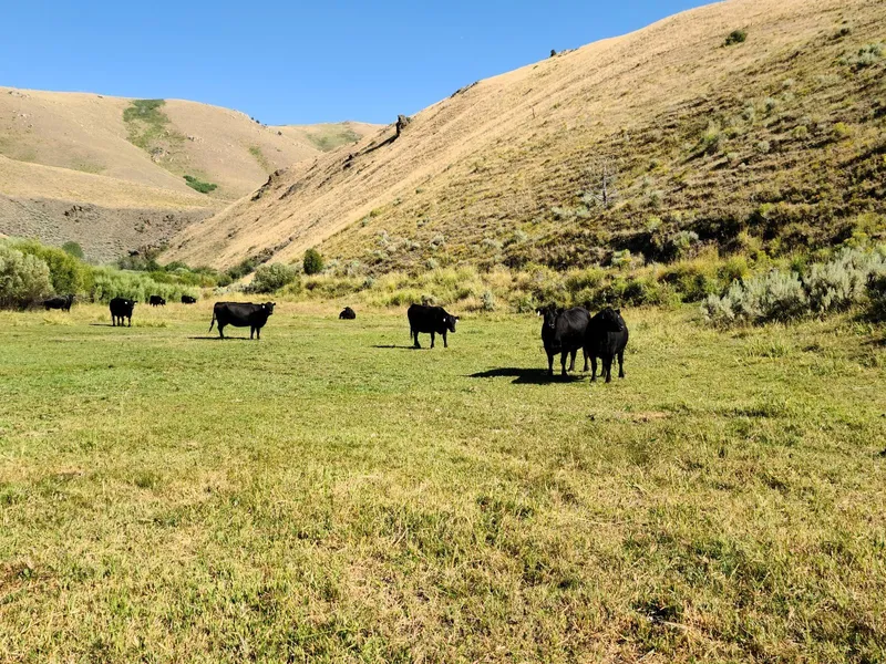 The property features a cow camp with corrals and a loading chute to support ranch operations, along with a cabin that is provided with spring water and a landline for basic living needs and functionality.
