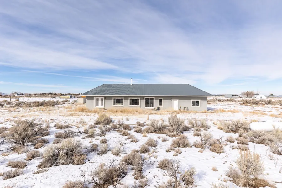 This custom-built home sits on over 7 acres, offering stunning views of the Rubies. Constructed with ICF blocks and featuring heated concrete floors throughout, the home has a modern, open feel. As you enter, you'll be greeted by the stained concrete floors that flow into the spacious living area, where large windows capture the breathtaking mountain views. A cozy wood stove with a beautiful rock hearth adds warmth to the space. The open-concept kitchen includes granite, an oversized island, custom cabinets, and a large corner pantry, with doors leading to one of the back patios. The oversized master suite features a walk-in closet and double doors opening to the second patio. The master bath offers pedestal sinks, a soaking tub, and a tiled shower. There are two spare bedrooms and an additional bathroom. Outside, you'll find new concrete around the home leading to an oversized, insulate...