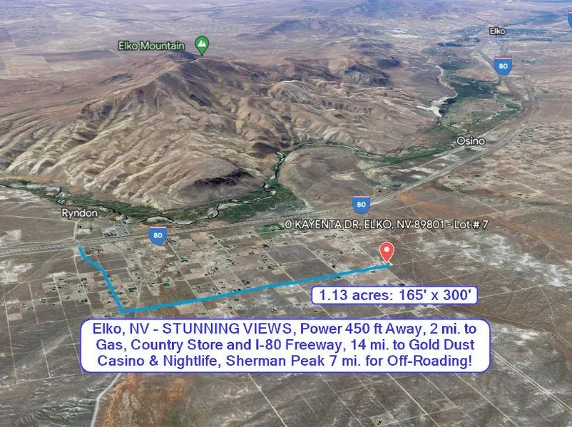Clean and flat 1.13 acre lot in Elko, Nevada, power 450 ft away, needs septic, no HOA, not in flood plain, zoned SR-22 Single-Residential, 2 miles to Sinclair Gas Station, Country Store and I-80 Freeway, 14 miles to Gold Dust Casino & Nightlife in Elko and Sherman Peak is 7 miles away for off-roadin