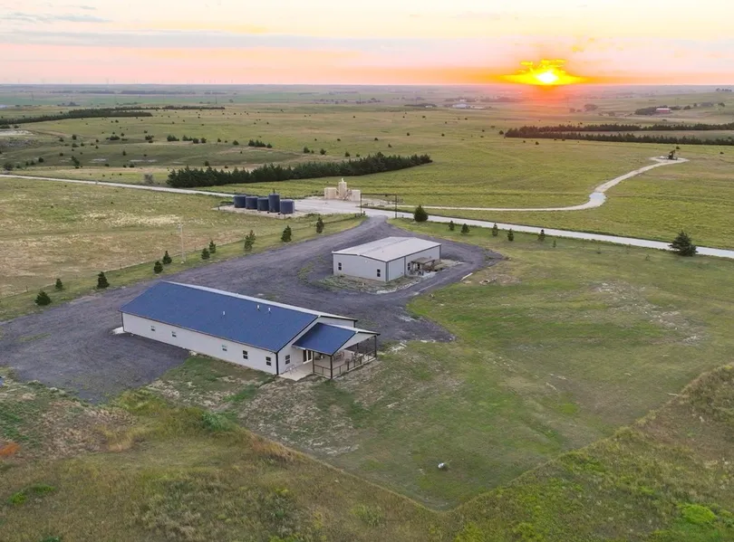 This once-in-a-lifetime opportunity presents an incredible custom hunting lodge spanning approximately 5,000 square feet, situated on nearly 20 acres with breathtaking views of the Western Kansas landscape. Located just 10 minutes from Hays, KS, and the Hays Regional Airport, this 50 by 100 lodge is perfectly positioned just 4 miles east of Ellis, KS, offering both convenience and seclusion.Built in 2021, the lodge offers 4,721 square feet of meticulously designed living space featuring eight bedrooms, including five guest rooms with double beds, one guest room with a single bed, and two luxurious master suites, each equipped with full bathrooms, king-sized beds, and bunk bedsideal for accommodating large groups in comfort.The heart of the home is a fully equipped kitchen adorned with high-end stainless steel appliances, elegant wooden cabinetry, and a large barnwood island complemented by rustic barstools. A striking wagon wheel chandelier adds charm and character. The open floor plan flows seamlessly into a spacious living area that includes a sizeable dining room table, a custom bar, and a cozy entertainment room with leather couches and a large flat-screen TV. This entertainment space doubles as a trophy room featuring impressive displays of the current owners deer and turkey harvests from the region.Behind a stunning custom sliding barn door lies a long hallway leading to the guest bedrooms and primary suites, as well as a magnificent shower room that boasts three large private showers, three vanities integrated into an extended countertop, and three separate toilet spaces behind locked doors. At the hallways end is a washroom complete with washer/dryer hookups and ample storage. Just inside the back door, hunters will appreciate a custom locker room outfitted with organized storage spaces to securely house hunting gear and clothing between excursions. A 16 by 18 storage room with a remote-operated overhead door is conveniently located at the northwest corner of the lodge, providing plenty of space for ATVs, UTVs, hunting equipment, and lawn care tools.At the front, a stunning 600 square-foot porch with a solid concrete floor and stylish railing offers a perfect retreat to relax after a long day of hunting while enjoying incredible sunrises with a hot cup of coffee.Whether hosting guests during hunting season, family gatherings, or special events, this exceptional lodge provides ample, high-quality space designed for memorable experiences. Truly one of a kind in this region, Prairie Breeze has enjoyed steady occupancy as an Airbnb rental, attracting hunters as well as families and groups seeking a unique and comfortable retreat. Dont miss your chance to own this remarkable Western Kansas hunting lodge.- 50 x 100 metal lodge- 4,721 square feet of living space- 8 bedrooms- 3 full baths- Spacious dining and entertainment area- Modern rustic kitchen with stainless steel appliances- Large bathroom with triple shower, vanities, and toilets- Enclosed patio (18 ft x 24 ft) with open fire pit, outdoor furnishings, and wood pellet grill- Locker room with 8 separate lockers for hunting gear, etc.- Central heat and air- Water well and septic system- 600 sq ft concrete porch with incredible views- 16 x 18 storage garage- Fully furnished- Two pond sites located South and West of the lodgeLODGEKEEPERS QUARTERSThe secondary building on the property is a large metal-constructed building with a 1,120 sq ft garage with sufficient space for parking vehicles and storing equipment. It also serves as a small dog kennel. The West half of this building is a 1,280 sq ft living space currently occupied by the property manager, who is willing to continue her role maintaining and managing the lodge for the new owner. This living area consists of 2 bedrooms, 1 full bath, and a pleasant open kitchen and living space. The kitchen features plentiful counter space and a beautiful island with a cutting board-style top. The living space within this building features beautiful dcor and wall colorations, providing a high-quality additional living space.- 1,280 sq ft of beautiful living space- 2 bedroom- 1 full bath- 1,120 sq ft garage- 2-car garage capacity- Built in 2021- Central heating & air- Water well & septic- Rock fire pit in the frontThis incredible lodge property is located less than 8 miles from Hays, KS, and only 10 miles from the Hays Regional Airport!Contact the listing agents Adam Hann (785.259.2469) or Mitch Keeley (785.259.0492) to schedule a full tour of the lodge today!