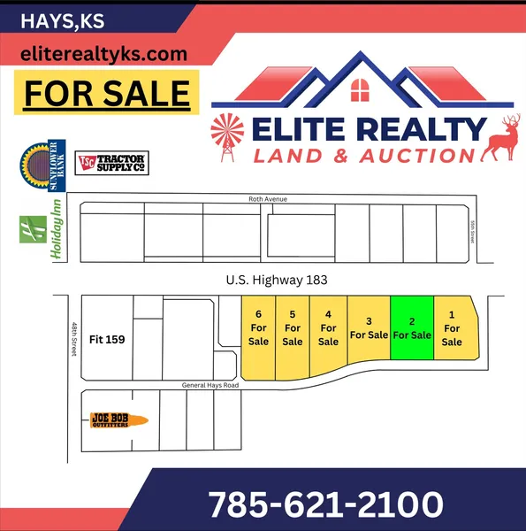Searching for a site to fit your next or first business endeavor? Do not look past this opportunity to own acreage right along Hwy 183 just 1+/~ mile North of where Hwy 183 meets Interstate 70 and Hays’ primary commercial retail area. 6 lots are available ranging from 2.5~2.9 Acres in size. General Hays Rd to the East offers off~highway accessibility while this property still allows you to reap the benefits of the Hwy visibility. Contact Nathan Goetz at 785~672~3246 or Mark Ottley at 785~623~1400 today for more details!!!!