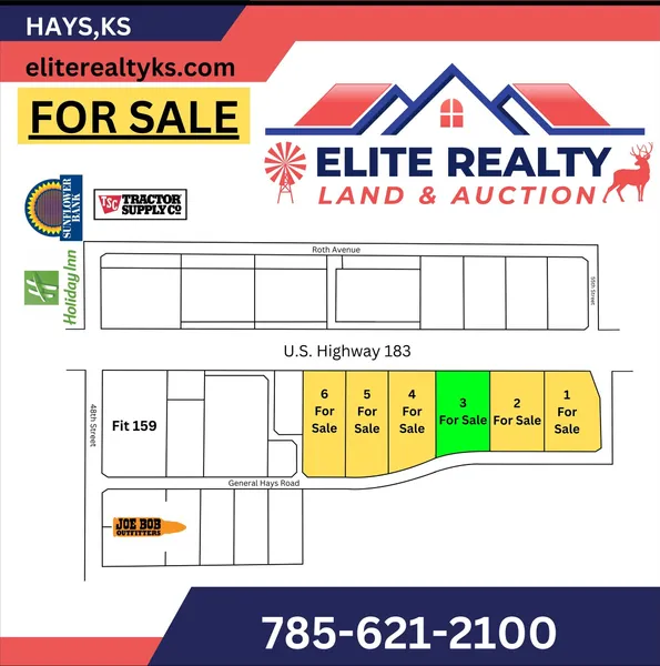 Searching for a site to fit your next or first business endeavor? Do not look past this opportunity to own acreage right along Hwy 183 just 1+/~ mile North of where Hwy 183 meets Interstate 70 and Hays’ primary commercial retail area. 6 lots are available ranging from 2.5~2.9 Acres in size. General Hays Rd to the East offers off~highway accessibility while this property still allows you to reap the benefits of the Hwy visibility. Contact Nathan Goetz at 785~672~3246 or Mark Ottley at 785~623~1400 today for more details!!!!