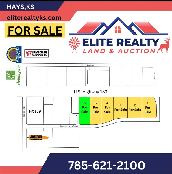 Searching for a site to fit your next or first business endeavor? Do not look past this opportunity to own acreage right along Hwy 183 just 1+\~ mile North of where Hwy 183 meets Interstate 70 and Hays’ primary commercial retail area. 6 lots are available ranging from 2.5~2.9 Acres in size. General Hays Rd to the East offers off~highway accessibility while this property still allows you to reap the benefits of the Hwy visibility. Contact Nathan Goetz at 785~672~3246 or Mark Ottley at 785~623~1400 today for more details!!!