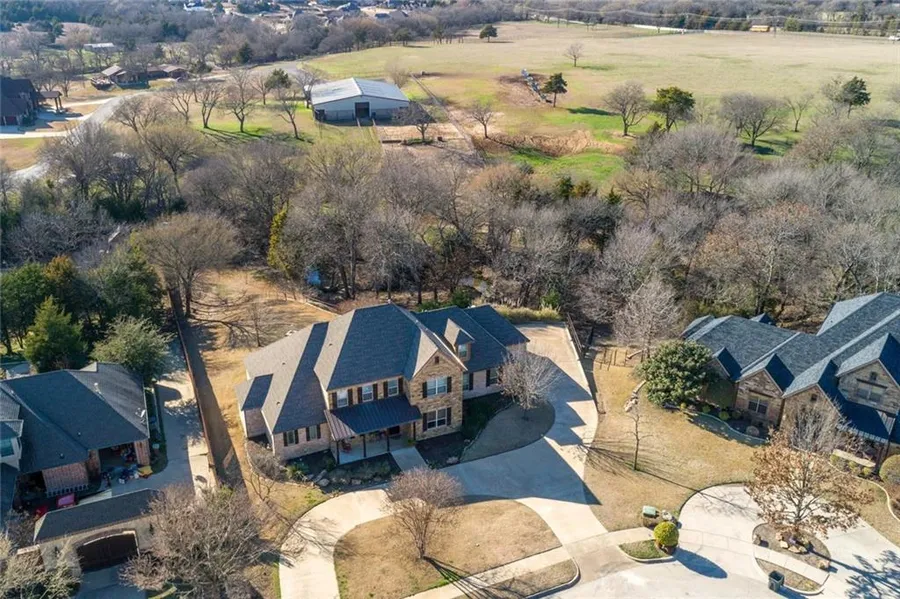Amazing 2 story custom designed 1 owner home on a quiet 1.122-acre cul-de-sac lot in the highly desirable Twin Creeks neighborhood. This Texas Hill Country Styled Farmhouse is on a heavily wooded lot with a spring fed babbling creek! The upscale kitchen is well appointed with built-in Electrolux fridge-freezer, double oven, and cooktop. Much desired master & guest BR with full bath down. 2 BR up with walk-in closets and both have a full bath. The game room upstairs is a great space. Back porch w fireplace great for family gatherings. 3 car garage is oversized with storage area to hold sporting gear. Country Living within the city limits and only 45 minutes to Dallas! Don't wait, this one is a MUST SEE!