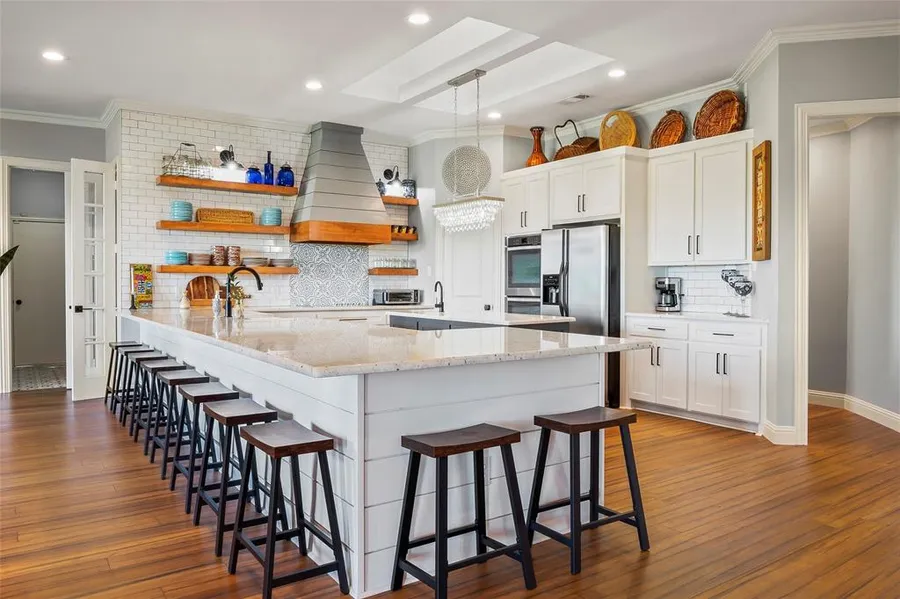 NO CITY TAXES! Remodeled, beautiful Texas-Sized Bedrooms. Open kitchen has 17 foot bar seating 10. The kitchen looks like HGTV showed up for this one! Floating shelves, shiplap vent hood, tile feature backsplash. Shaker cabinets with soft close hardware. Walk-in pantry has a motion light and you will also find a motion light under the farm sink Flagstone patio with firepit & BBQ. Master suite has private living area, floating shelves and a beautiful shiplap fireplace. Master bath features elegant soaking tub and beautiful walk-in shower, both featuring gold fixtures as well as his and hers walk-in closets and separate vanities, both with lighted spa mirrors. Mounted heated towel rack. The stairs even had a makeover with the cutest tile risers! At the top of the stairs is a large media room with projector screen. Built-in speakers are wired for surround sound. LED lighting to flash with t...