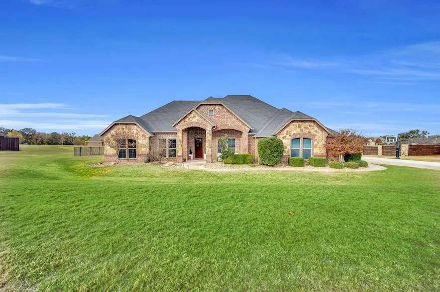Situated on a premium pond-backing lot, this beautifully maintained custom home offers the perfect blend of refined living and resort-style outdoor enjoyment. From the moment you arrive, the striking stone and brick elevation, manicured landscaping, and inviting front entry set the tone for the quality found throughout. Inside, the open and thoughtfully designed floor plan is filled with natural light and timeless finishes. The heart of the home features a spacious living area that flows seamlessly into the kitchen, making it ideal for both everyday living and entertaining. The kitchen showcases custom cabinetry, generous counter space, and an oversized island that anchors the space and invites gathering. The primary suite is a true retreat, offering peaceful views and a spa-inspired bathroom complete with a freestanding soaking tub, luxurious walk-in shower, elegant tilework, and designer lighting. Secondary bedrooms are well sized and thoughtfully placed for privacy and flexibility. Step outside to your private backyard oasis where luxury meets lifestyle. The resort-style pool with rock features creates a stunning focal point, while the expansive patio and cabana provide the perfect setting for entertaining, relaxing, or enjoying quiet Texas evenings. Beyond the pool, the property opens to tranquil pond views, offering both beauty and privacy rarely found. Additional highlights include a three-car garage, extended driveway, mature landscaping, and a setting that feels both private and connected to the surrounding community. This exceptional property offers space, comfort, and elegance in a setting designed to be enjoyed year-round. Homes with this level of outdoor living and pond frontage are truly special. Schedule your private showing and experience it for yourself.