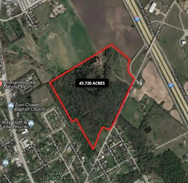 DEVELOPMENT OPPORTUNITY - OPPORTUNITY ZONE - Commercial, Residential, Mixed Use in booming city of Ennis. Level land with on-site city utilities. Property located just off I-45 access road with excellent access from the freeway. 39.033 acres parcel currently zoned as CC and 4.687 acres zoned as L-IM. Could be rezoned for Multi-family, Single family residential neighborhood with retail in the front. Approximately 1,140 ft frontage on Crisp Road.