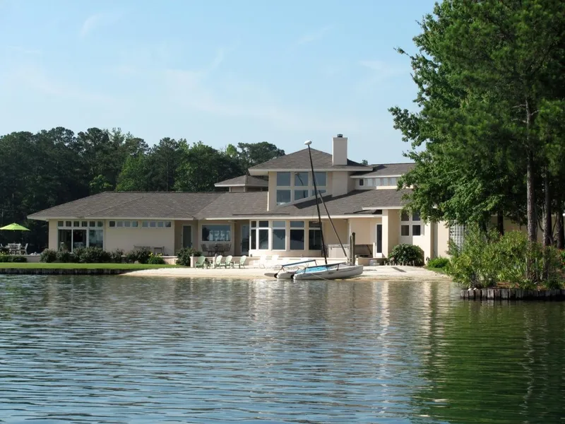 The architecture of this home combined with the unique lot make this one-of-a-kind Trillium property a great find! Home offers an open floor plan with the kitchen opening up to a family space and the lake beyond! The round living room is the heart of the home with views over 1 of the beaches to this propertys private island. Five bedrooms with wonderful lake views from each!
