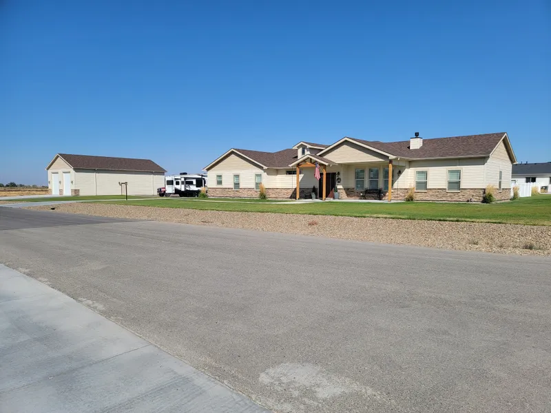 Better than new. All new landscaping, vinyl fencing, custom blinds and shutters, single level, split bedroom, corner lot. 34 x 50 shop which can be entered or exited on each end with 4 overhead doors. New RV Garage added with concrete slab, 48X18, 20ft tall painted to match home. Lots of room for parking. Lots of upgrades, all new appliances to include washer and dryer. Lots of concrete and asphalt on this lot. Easy up keep and great access. Don't miss this beautiful home and shop. It is a must see. Private patio, very little grass to mow. Away from Freeway and Quiet. Built by Liberty Homes.