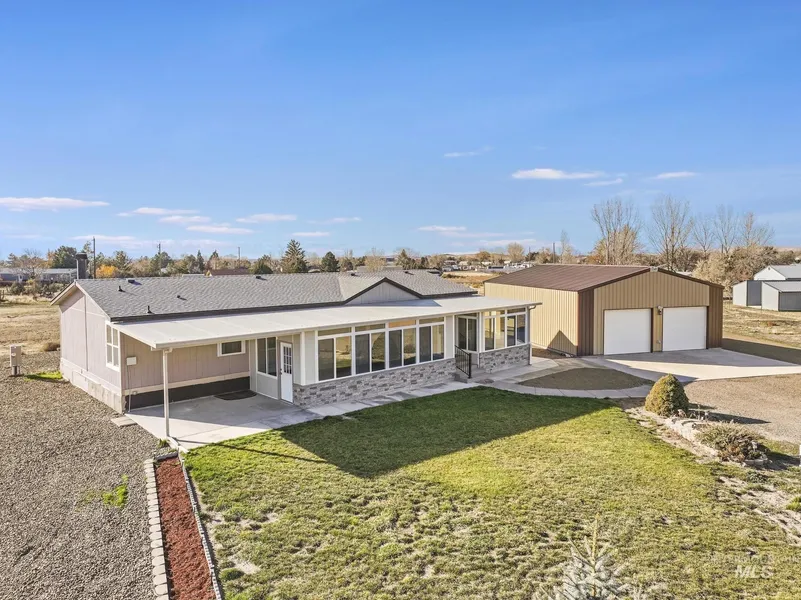 Unobstructed views of Bennet Mountain welcome you home to this tidy acreage bordering BLM land and the Mountain Home reservoir. The sunroom offers a unique and comfortable area to enjoy the sunrise with a cup of coffee, set up a workout room or just hang out as a lounge area. Steps away you can sit outside under the covered patio, enjoy the fire pit or tend to the nearby raised garden beds. Features inside include new carpet, new laminate flooring, fresh interior paint, new light fixtures, newer windows, butcherblock breakfast bar, pull out storage in the kitchen cabinets, open living spaces, split bedrooms and a soaker tub in the primary bathroom. All this is on the light filled main level. Just outside of the utility room, take the covered steps leading to the partially finished basement. New carpet, egress windows and finished recreational or living area give you plenty of room to spread out. The unfinished space has a fruit/storage room, shelving and the ability to complete as you choose. Park your cars, ATV's or the boat in the 30x40 Cleary shop. It's fully insulated, heated with a pellet stove, has concrete floors and electric service. A second 20x20 shop with concrete floors and electric give you more space for all your needs. Room for horses, chickens and livestock. Please call to set up an appointment to view today.