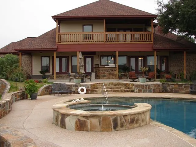 As you enter the home the warmth and peacefulness surround you. The entry leads you directly into the living area and kitchen with large French doors opening to the covered patio area allowing a perfect view to the pool. Throughout the home you will find granite countertops, custom built knotty alder wood cabinets, stained and scored concrete floors, some carpet and ceramic tile, beautiful light fixtures, surround sound, handicap accessible doorways, and unique mirrors and bath fixtures. All the appliances are stainless, Frigidaire brand. The living area has a fireplace flanked by cabinets and a 52” flat screen TV. Downstairs there are three bedrooms with a full bath to service them and a half bath just off the living area. Also, the master bedroom and bath are located on the bottom floor. The master bedroom has French doors opening to the outdoor living area and pool also. The master bath boasts a large Jacuzzi tub and unique semi-circle tile his and her shower. Two large walk-in closets and two vanity areas complete the master suite area. The kitchen is a cook’s delight with double ovens, granite countertops, large stainless refrigerator/freezer combo, sit down bar, and large island. From the kitchen you have views to the countryside and the pool area. Step just outside the kitchen/living area through the French doors and you have the convenience of a complete outdoor kitchen for ease of entertaining family and friends at the pool.