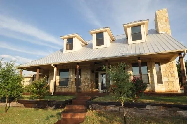 This listing is a prestigious ranch home located on 24.020 acres, complete with shop, working pens, hay barn, stocked pond, and a party patio! The home sits upon a slight hill, basking in all it's splendor. There is a concrete walk up to the front door, surrounded on either side by beautiful roses and fresh, young trees. The covered porch wraps around to the right side of the home, providing a nice place to sit and enjoy the view. There are two ceiling fans on this lovely front porch to provide you a nice breeze when the weather is warm. The home is encased in various shades of white to off white shaded rock/stone and the high pitched roof has three dormers on it to show off it's majestic state. The front door is inviting with it's decorative windows around and it's slightly inset into the home. Walking in, one is greeted with a rustic Texas star inlayed into the stained concrete foyer f...