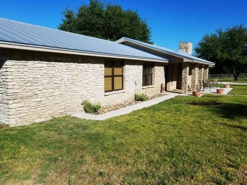 IMPROVEMENTS: A 2653 SF country/ranch style home with 4 bedrooms, 2.1 bathrooms, a Limestone exterior, new standing seam metal roof, and covered carport. A living room with a stone fireplace with blower, and stone hearth, a knotty pine plank cathedral ceiling with exposed beams, and a tile floor. The kitchen has a title floor, wood stain cabinets, Formica countertops, tile back splash, Kitchen-Aid, Thermador & GE appliances dishwasher, oven and microwave with an adjoining dining area. A garden room overlooking the pool. The bedrooms have carpet & ceiling fans. The master bath has a tile floor, jetted tub and a separate shower. The hallway, 2nd & 3rd bedrooms have carpet. 2nd bath has tile floor, tile vanity with a tub/shower combination. The bath with tile vanity & drop-in sink. An electric / propane home and originally built in 1983 but remodeled in 2012. Covered back porch with stone columns and a nice size pool and spa with flagstone coping, and aggregate decking. Black all steel yard fence with concrete footing. A 42x105 all metal building with new exterior sides and roof, encompassing equipment storage, an apartment, shop area, and an office. A nice 6 stall shed row horse barn with covered concrete alleyway. A large all steel 5250 building used for hay storage, tack and feed rooms, and a cover for an excellent steel cattle working pens with an 18-wheeler loading chute. Feed bunk troughs. A large pipe, wire, & stave outside roping arena with return alley, holding pens, 2 story viewing deck, and lighted.