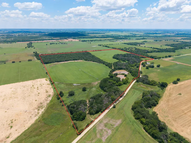 98.17 acres (to be surveyed) with 35 + or - acres of irrigated Coastal hay ground, and approx. 40-45 acres of heavily wooded land which includes a large creek feeding into 2 stock large ponds. These ponds are full at present and are connected as one, covering about 1.5 acres total.