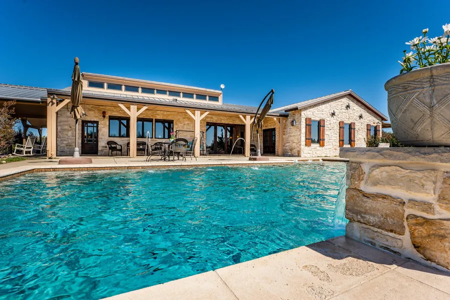 Masterpiece of design privately appointed on 21 acres; featuring ICF Post Beam construction with an R50 rating, Salado Stone, & Pella windows. Stunning custom woodwork with mahogany doors, & acacia cabinets planned to perfection. Chefs Kitchen designed for the meticulous cook includes black leathered granite with a red dragon granite accent island, commercial grade appliances, double ovens, & dual dishwashers. Hand scraped acacia wood floors and mink Jerusalem stone floors in the bath areas. Truly divine master suite with ample room for a seating area. Gorgeous office with custom built-ins fit for any home business. Outside is a luxurious PebbleTec saltwater pool with waterfalls, tanning ledge, expansive covered porch, 40x50 Mueller shop with overhang & electric. Property is cross-fenced into 2 large pastures with water. Backup Generac 20kw LP generator in case of power outage. Each deta...