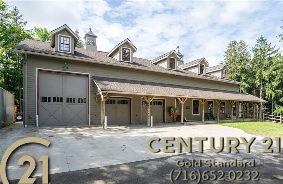 Nearly new 7744 sqft Adirondack Farm Style Structure presently used for Home office. Full drive-in basement. In-floor hydronic heat in all floors. (Basement, Main floor, Attic & Attached Over-sized Main Garage). 3 Overhead doors on huge open garage with a 14ft high 8ft wide door & two other 8x8 ft. high overhead doors. All with electric lifts. Over sized double hung Pella windows. Wrap around porch/deck is covered on one side. Cantilevered 2nd floor balcony. Attic large enough for an apartment. Unit is spinklered in some areas. Cement Board Hardy Plank siding, 50 year asphalt shingled roof. 2x6 construction. 5/8 inch plywood sheeting. Property contains 18.06 acres. There are several building on property for storage & Rustic Cabin for Camping. Also listed combined w/ 2762 Blakeley as #B1209223.