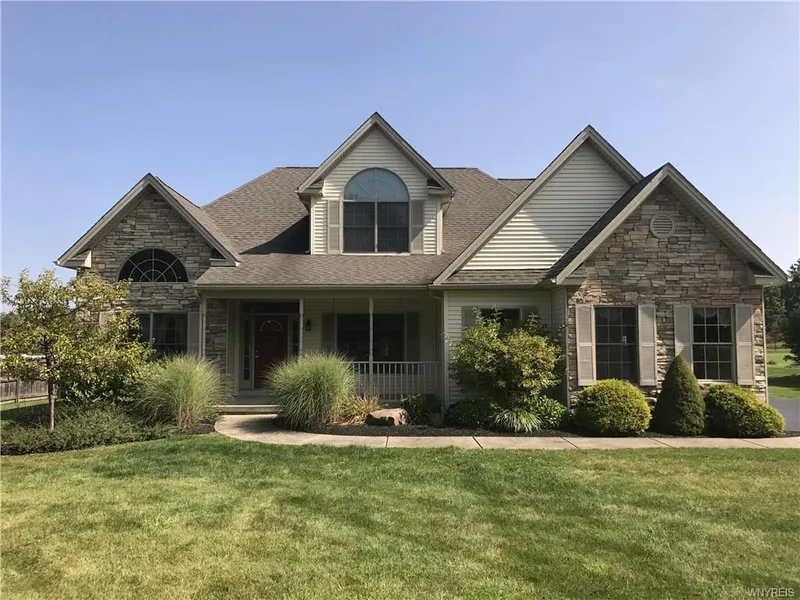 Beautiful former model home this 2006 built, 4 bed 2.5 bath home welcomes you with a great room with cathedral ceilings, gas fireplace and open kitchen and eating area. Spacious and open the custom kitchen has granite counters and a breakfast area which overlooks an expansive back yard. Cherry hardwood floors and crown moldings add to the bright and open feel. Additional highlights of the first floor include a generous master suite with walk in closet, a first floor laundry, office with French doors and an attractive formal dining room. The 2nd floor overlooks the open floor plan and has three good sized bedrooms and a full bath. All this professionally landscaped with front and back covered porches. Close to Emery Park and the 400 and in East Aurora school district.