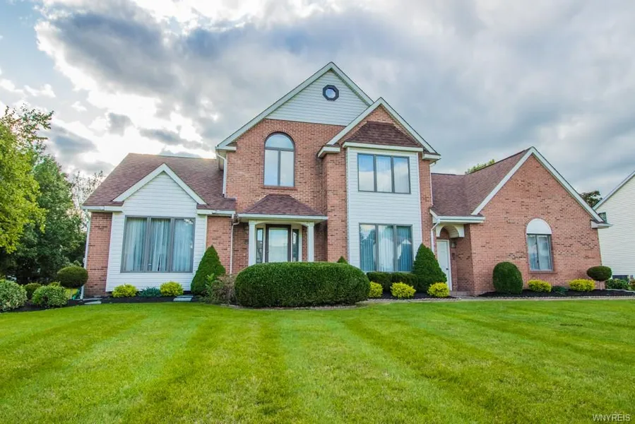 Stunning 3 bedrm 2 full bath Traditional home Custom Built with Every Attention to Detail! Beautifully landscaped park-like private setting complete with covered portico, which leads to a large circular paver patio…perfect for entertaining! Lovely marble foyer. Four-season sunroom off bright eat-in kitchen w/built-in kitchen desk. (Kitchen appliances stay with home!) Large family room with cathedral ceiling, gas fireplace and marble dry bar. Formal dining room, first floor bedroom, full bath and laundry. Master suite offers extremely large walk-in closet. Second floor office w/fabulous lighting! Newer roof. Two & ½ car garage with paver driveway. Home security & intercom system. So much storage space! One owner. Pet and smoke free. Quick close…low taxes and Clarence Schools!