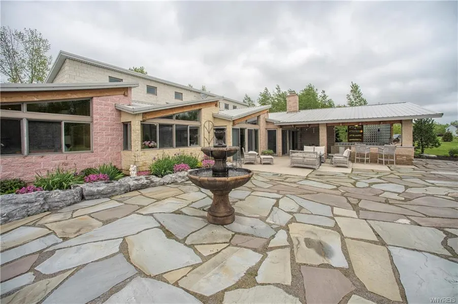 Step inside this one-of-a-kind contemporary and youll say Wow! Solidly constructed of masonry walls and dramatic wood beam cathedral ceilings, natural sunlight and ventilation abound throughout. Plentiful windows and 2 unique wood burning open sided fireplaces bring warmth and atmosphere to this home which boasts gorgeous Italian tile radiant heated floors for unparalleled comfort and efficiency. Expansive 2,000+ sq. ft flagstone patio with covered outdoor kitchen-bar with high-end SS appliances, an entertainers dream. Surrounded by lush gardens and privacy walls of glass block and a living green wall your guests will be awed by stunning sunsets in this tranquil rural setting. 4 BDRMS, 3 full baths, 3 car gar, and tons of storage. Handicap accessible. Flexible usage as a 3765 sq. ft. single family home or in its current configuration w in-law/rental unit w separate entrance. Can easily and inexpensively be converted back to a single family home. 10 minutes from Transit Rd. See also listed as B1308534 (multi-family unit)