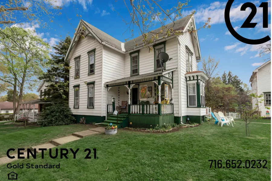 Six bedroom historic home w/incredible charm & character! Original floors throughout the entire house & nine foot ceilings on first floor. Large family room & living room, black gas fireplace included. First floor bedroom w/large closet. Formal dining room has original wainscoting, country kitchen w/large pantry, all appliances included. Full baths on each floor & upstairs bath has wall fireplace! Five additional bedrooms upstairs all w/good sized closets. Master bedroom has private sunroom. Additional rooms upstairs are trunk room & small office w/closet. Basement has laundry space, sump pump, lots of built in storage, includes washer & dryer & all a/c units. Open front porch, enclosed sunroom, porch w/hot tub included. Fully fenced yard & additional side lot. Outdoor patio & firepit space. Carriage house is all storage. This home has endless potential, village charm & is just five minutes from the beach, walkable to downtown Angola & 30 minutes from downtown Buffalo. Offers will be reviewed as they come in.