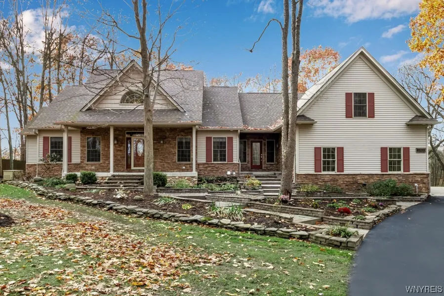 A masterpiece of design & craftsmanship! This 9.72-acre estate is tucked away from the road, offering the utmost in privacy & nature's embrace. The house sits on 5 acres w/2 adjacent 2.1/4 acre building lots. Cultured stone columns w/elegant lighting illuminate the driveway. Imported stone & tile throughout. Soaring 19-foot cathedral ceilings in the foyer & great rm. 1st flr w/limestone flring, 9ft ceilings & laundry. Radiant heat on all 3 levels. Kitchen has granite countertops & sink, Mauser cabinets, pot filler, pantry, & Viking app. 1st-floor primary suite w/gas fp, tray ceiling, WIC, & ensuite w/dual vanities, shower w/dual shower heads & body jets, whirlpool tub, & travertine wainscoting. Upstairs offers a bonus rm w/3 WIC, full bath, Den (Possible 4th Bed) w/LVP flring & 2 walk-in closets. Walk-out basement (1968 Sqft included in total sqft) w/coffered ceilings, travertine flring, full bath, 2 fireplaces, full kitchen & private entrance, making the perfect in-law suite. The 3-car garage w/9ft drs, radiant heat, drain, utility sink, & 10.5 ft ceiling. Generator, AC, low taxes. Updates:AC, tear-off roof & gutters, boiler, composite deck w/vinyl railing & carpet. Prof measured