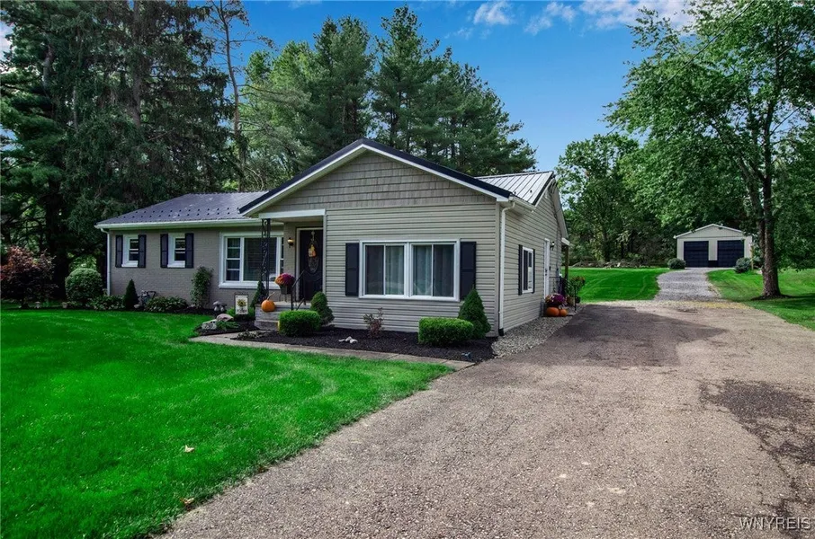 Welcome to your dream home! This beautifully appointed ranch-style residence boasts 3 bedrooms & 1 full bath. Step through the front dr into a bright & inviting LR, that seamlessly flows into the formal DR, perfect for gatherings! The FR features charming barn drs, tall ceilings & brand new carpeting. The efficient kitchen has white cabinets, ample prep space, & stainless steel appliances included. The partially finished basement adds extra LR, complete w/ a fantastic bar area—ideal for hosting the Bills games! Step outside through the sliding dr to your freshly painted covered deck, equipped w/ sun shades & overlooking the expansive 1.67-acre property! Enjoy the serene views of your brand new pole barn, stunning flower gardens & meticulously landscaped grounds. The impressive 30x40 pole barn is equipped with concrete floors, water & electric, providing endless possibilities for storage or projects. Wide driveway offering ample parking! Newer metal roof, septic, generator, AC & mechanics! PERFECT LOCATION: just off the 400, 2 mins from the EA Village & the EA Country Club. Affordable Town of Elma taxes. Iroquois School District. MOVE IN READY! All offers due by 10/10 by 12PM.