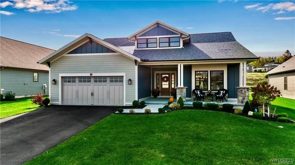 Welcome to your nearly new forever home! Located just outside the charming village of E. Aurora this expanded Patriot model offers the benefits of low condo taxes. You’ll appreciate the beautifully landscaped yard, Hardie board siding, full-width front porch, & stunning entry door w/ sidelights. Step inside to find gorgeous HW floors, stylish shiplap walls, & 9' ceilings. The spectacular kitchen features custom cabinetry, granite, SS appliances, & an inviting island w/ seating. The living & dining areas boast a tray ceiling w/ crown molding & a cozy gas fireplace. Custom craftsman columns lead you into the sunroom, where a cathedral ceiling adds to the spacious feel. Den w/ glass French doors offers the flexibility of a potential 3rd bedroom. The large primary includes a WIC & beautifully appointed bathroom. Custom blinds/shutters throughout. This home is designed for easy living w/ 1st ...