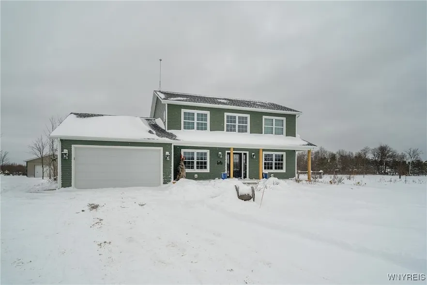 Prepare to fall in love with this captivating home! At just 5 years young, this property offers modern living on over 7 acres of stunning, picturesque land. As you step onto the covered front porch and through the gorgeous front door, a two-story foyer greets you with a warm welcome. To the right, a versatile room currently serves as a second family room but can easily serve as a formal dining area. The conveniently located office at the front of the house ensures a productive workspace. Cozy up in the inviting family room, complete with a gas fireplace beautifully set within a partial stone wall. The kitchen is sure to impress, featuring an island/breakfast bar and a stylish stone double kitchen sink. First-floor laundry adds to the convenience, along with a half bath pre-plumbed for a shower. Holding on to the gorgeous wrought iron railings, upstairs you'll find three generous bedrooms, including a luxurious primary ensuite with a walk-in closet, double sinks, and a soaking tub. Solid 2-panel arch top doors lead you into every room and closet throughout the house. The basement, equipped with an egress window, is pre-plumbed for a bathroom, offering the potential for future expansion.Just stepping out of the sliding glass doors in Kitchen you will be treated to a beautiful patio. Outside, a shed and a pole barn provide ample storage for all your outdoor equipment. The pole barn boasts a 30-year steel roof, full insulation, and a heater. The seller has enhanced the property's natural beauty by planting over 200 hardwood trees, including maple, sycamore, oak, white pines, and scotch pines. Adding to this lush landscape are Concord and White grapes and blueberry bushes. This home truly has it all! Offers will be reviewed as they are received.