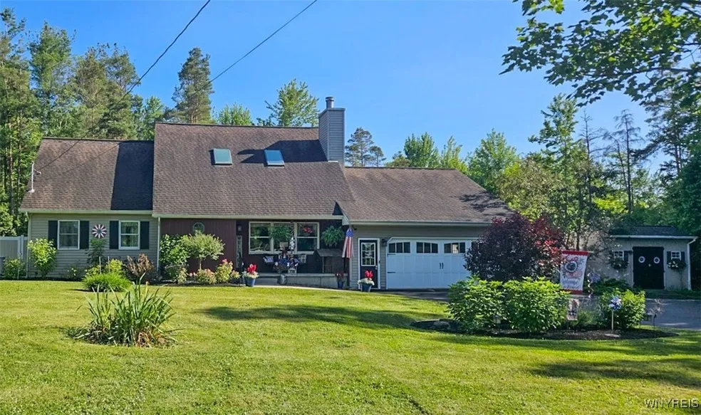 Welcome to this exceptional custom built home on nearly (2) acres, 3 minutes to East Aurora village & 25 minutes to Buffalo & Buffalo Intl Airport! Impeccably maintained, shows like a new build! 2-story family room addition in 2000 has a 19x18ft high window-wall overlooking a private wooded yard. A wood-burning fireplace, radiant heat flooring & sliders to patio, round out this room. Gourmet updated kitchen w/hickory cabinets, two granite breakfast bars, Thermador gas cooktop, double convection ovens, two possible eating areas, & two pantries. Flexible floor plan! Living room w/vaulted ceiling, skylites, stacked stone fireplace & hardwood flooring, presently used as a formal dining room. 1st floor laundry & back hallway from garage to rear patio & pool. 1st floor primary with walk-in closet. Primary has 1st floor bath with air jet tub, walk in shower, ceramic floor with radiant heat, bay window & sonotube skylight. 2nd first floor bedroom w/double closet could be an office. The second floor has a bedroom, full bath & a 17x13 loft that makes ideal office or studio space. Vacation at home in this beautiful outdoor oasis! Inground Gunite pool/spa combination by Beauty Pools (2005), 32x16 heated pool, 8' hot tub with adjustable jets. State of the art controls for pool systems. Just off family room & kitchen is a 21x18 pebble stone patio w/new awning to be installed. Permanent poly wood counter w/outdoor sink for summer kitchen/bar. Custom firepit. The yard is fully fenced. There are 2 sheds as well as a second driveway to get to back yard. Watering system, central vac, security system, surge protection, & a natural gas generator are just some of the extras. Private yard! Not a drive by! Must see inside! Square footage is inaccurate in the tax records. Square footage has been updated per floor plan measurements. ***Note offers due Monday 3/10 at 2pm.