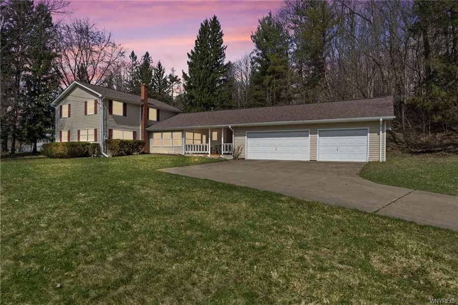Welcome to 4365 Four Rod—a perfect blend of country charm and modern convenience! Nestled on 1.4 scenic acres within the Iroquois School District, this 2,380 sq. ft. home offers the best of both worlds, just five minutes from NY-400. Step inside to discover a beautifully renovated kitchen (2022), featuring elegant quartz countertops, a farmhouse sink, and stylish brass fixtures. The first floor boasts brand-new flooring throughout, a bright and airy sunroom, a massive living room with stunning exposed wood beams, a cozy second sitting area with a pellet stove, a full bathroom, and a convenient first-floor laundry room. Upstairs, you’ll find another full bathroom and three generously sized bedrooms, each with ample closet space. Outside, enjoy a spacious 3-car garage complete with a wood burner and a bar—perfect for entertaining. A breezeway connects the garage to the house, leading to a rear deck with a charming stone retaining wall and a fenced area, all overlooking a serene, wooded backyard. The home’s mechanics are just as impressive, with a full tear-off roof (2023), a furnace (2016), 200-amp electric service, and extensive plumbing and electrical upgrades. Showings begin immediately, with delayed negotiations until Tuesday, 4/8, at 1 PM.