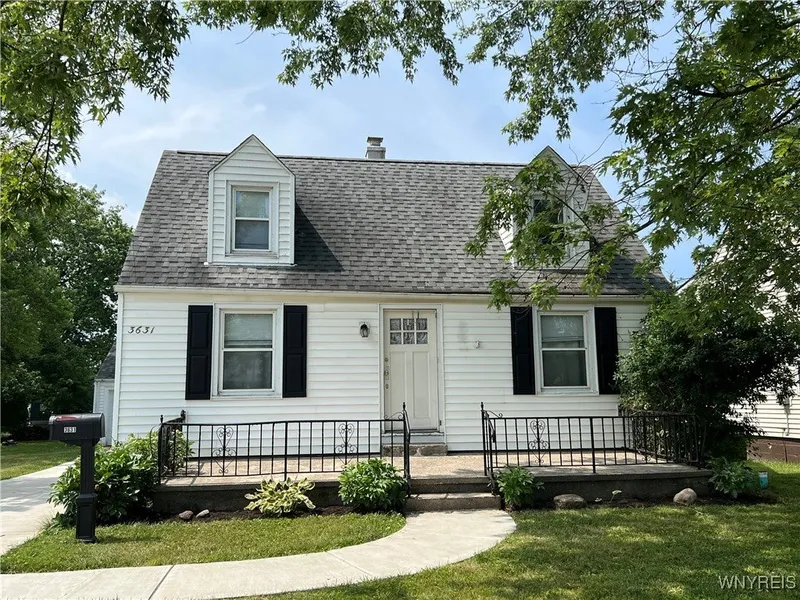 Charming Cape Cod in Prime Location! Welcome to this Sweet Cape nestled on a quiet neighborhood street with a large, inviting front porch. The main level features a spacious living room with a walk-in closet (other rm), a 1st floor bedroom, an updated full bathroom, and a kitchen equipped with 2021 Frigidaire SS Refrigerator & Stove, a ceiling fan light & windows overlooking the backyard & the two-car garage. Upstairs, you'll find two generously sized bedrooms and hallway with built-in drawers and cabinets. Most of the home features hardwood floors. Major Updates Include: 2023: New Gutters routed to the Storm Drain. 2021: New furnace & central air, concrete driveway, and basement waterproofing. 2020: Upgraded electric service with 100-amp panel box. 2018: New sewer line. The basement includes the washer & dryer and offers ample space to create a rec room too! All the big-ticket items are done—just bring your personal touch to make it your own! Centrally Located just a 10-minute drive to downtown, minutes to the Thruway or a short walk, bike to Woodlawn Beach State Park!