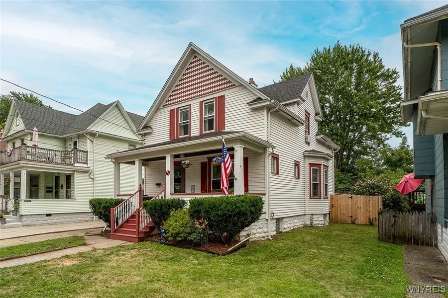 Welcome to 69 Simson Street! This charming 3-bedroom, 2-bath home combines character, updates, and a highly functional layout-all in the heart of Tonawanda. Step inside through the covered front porch into a spacious living room that flows into a bright dining room with a bay-style window nook. The kitchen is paired with a large walk-in pantry, offering plenty of storage. Off the back, the patio doors lead to a full deck where you can relax or jump right into the like-new above-ground pool-a true backyard oasis! The main floor also features a convenient mudroom/side entry for everyday living. Upstairs, the primary bedroom features its own walk-in closet, private balcony, and a dedicated staircase connecting directly to the first floor. Two additional bedrooms-one oversized and one perfect for a guest room, nursery, or office-offer versatility. A full bath completes the second level. Additional highlights include: - New roof (2021) for peace of mind - Brand-new fully fenced yard for privacy - Garage + full basement for storage - Covered porch and dual staircases adding charm and function This home is ideally located just steps from Delaware Street, and very close to the Rails to Trails walking paths, the Niagara River, and just down the street from North Tonawanda. Shops, coffee spots, restaurants, and the scenic Erie Canal are also right at your fingertips. 69 Simson Street checks all of the boxes-a perfect blend of comfort, charm, and location!